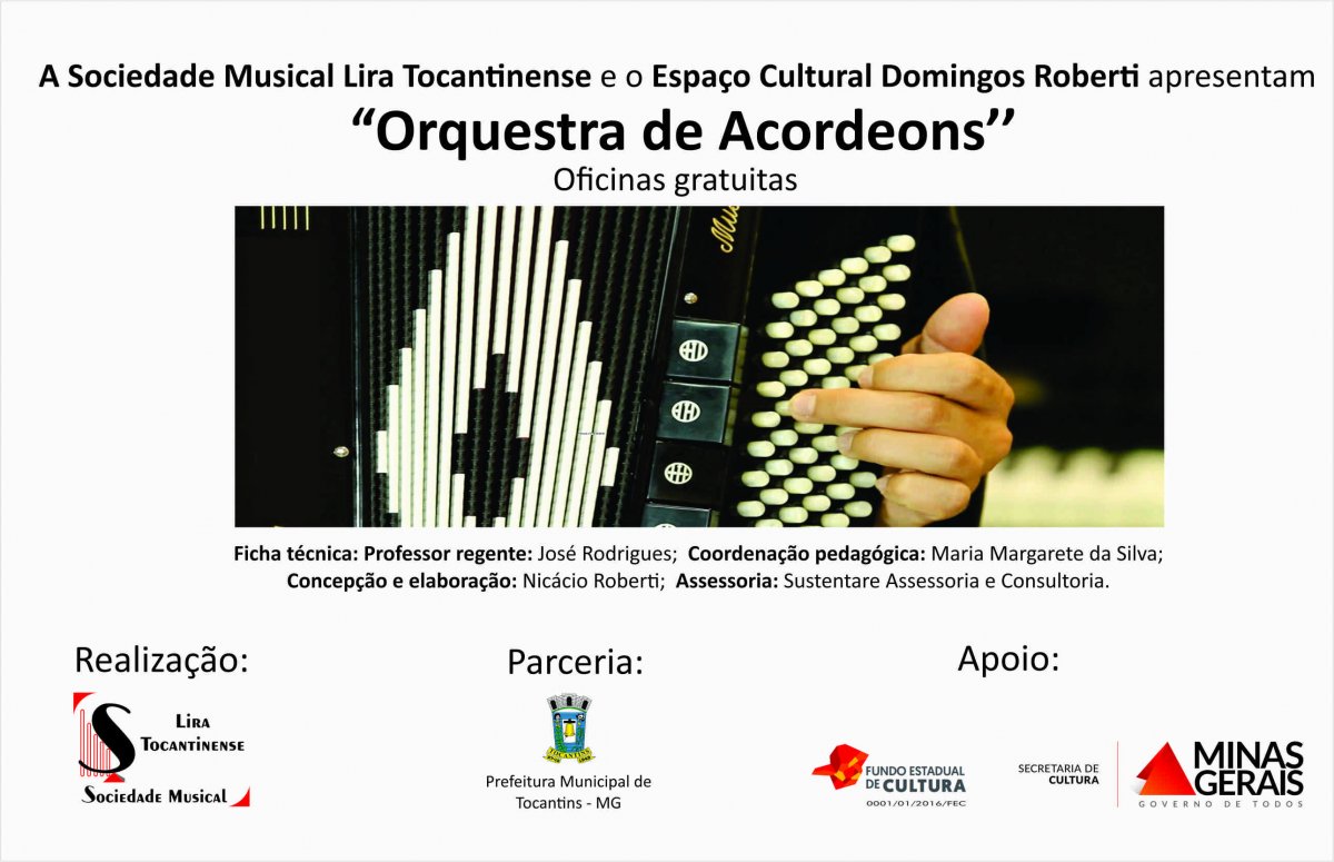 A Sustentare Assessoria e Consultoria elabora projetos e realiza readequações em projetos aprovados parcialmente junto ao Fundo Estadual de Cultura de Minas Gerais. Um desses projetos bem sucedidos que tem a nossa parceria é o projeto "Oficina de Acordeons", desenvolvido pela Sociedade Musical Lira Tocantinense no Espaço Cultural Domingos Rober...